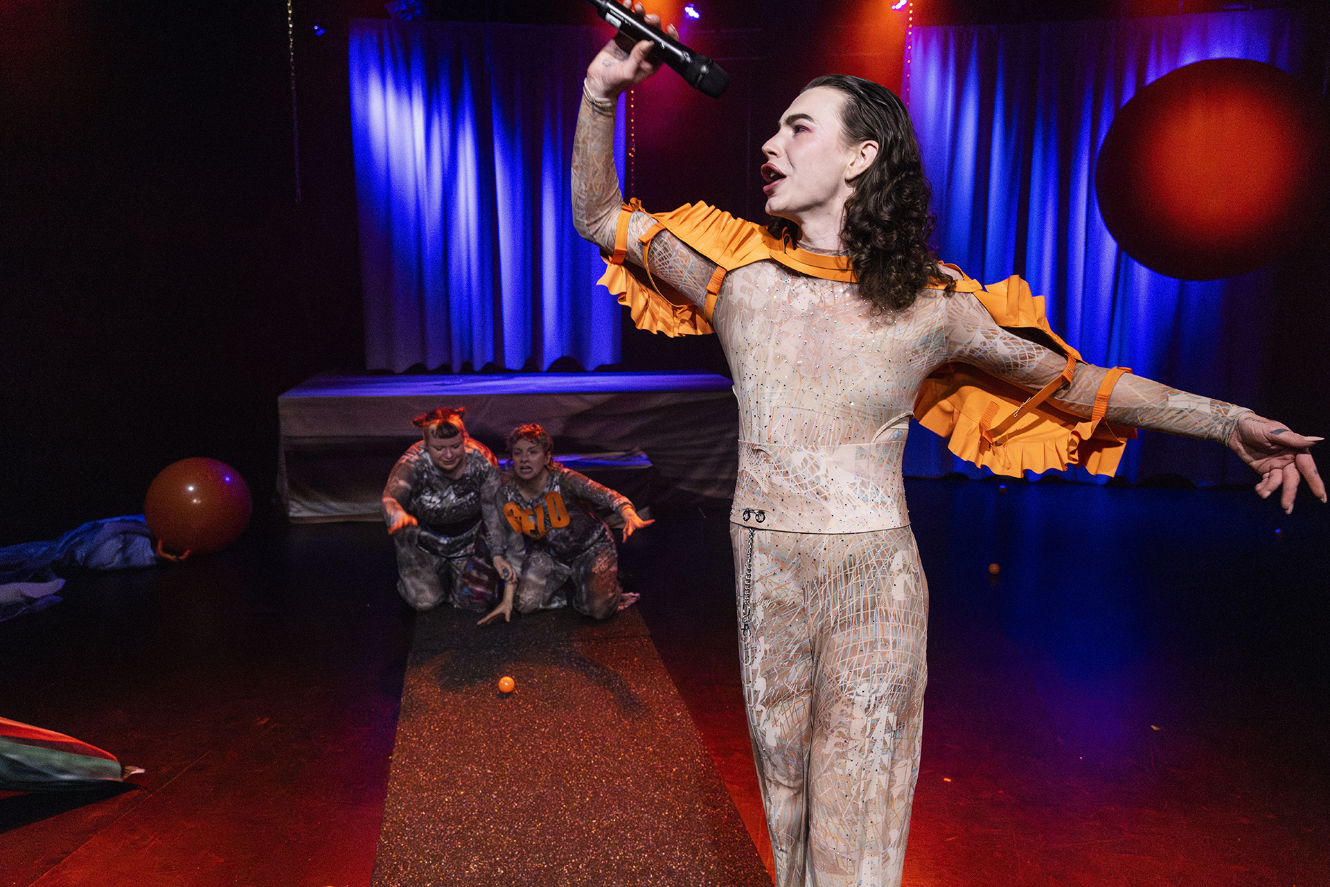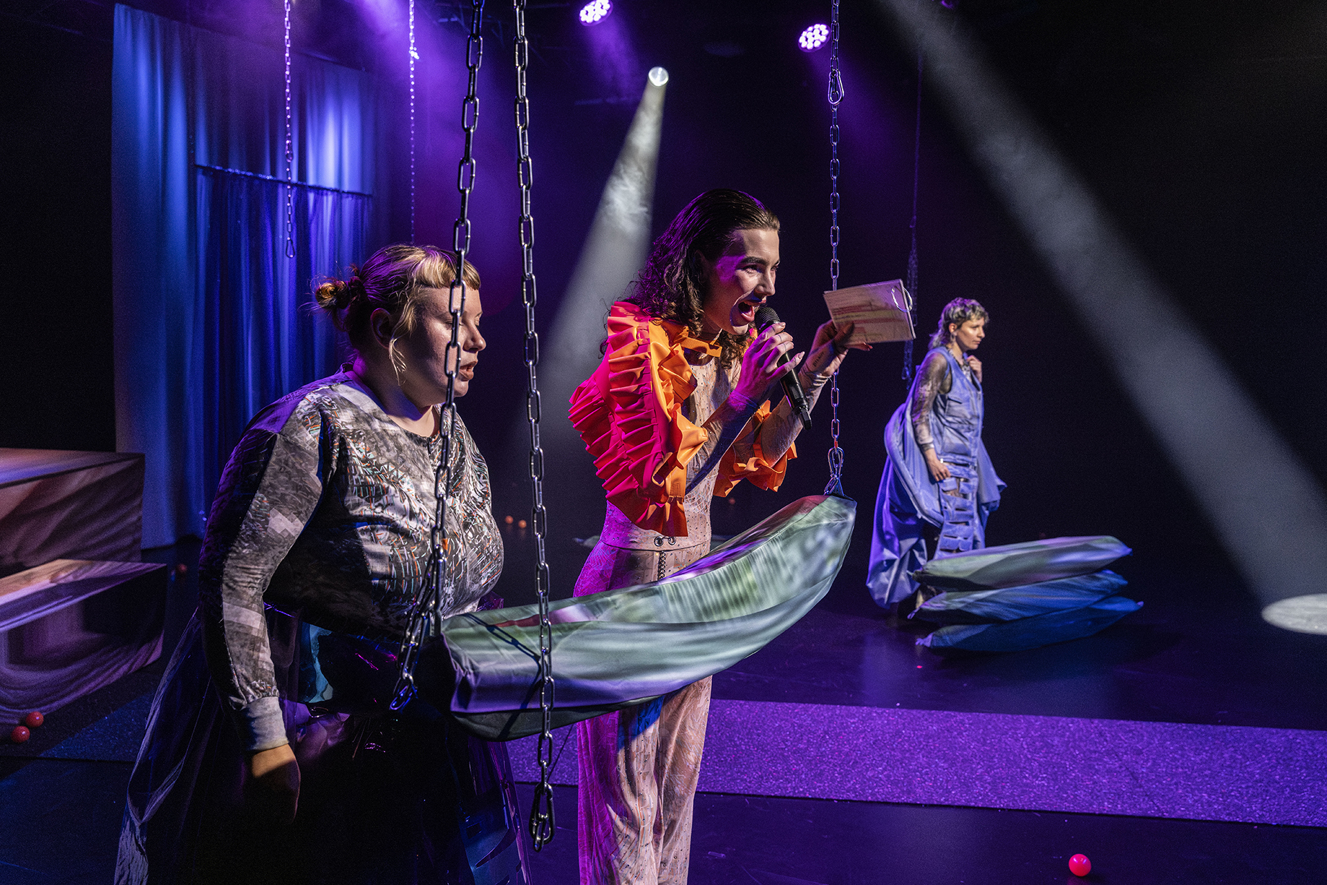 Die Performerin und Chanteuse Géraldine Schabraque führt in der Rolle der FUTURE (of Economy) durch den Abend und stellt die Puppenspieler* innen und Performer* innen Nathalie Wendt und Frieder Miller als ihre Guests in unterhaltsamen Duellen gegenüber. Die FUTURE schlüpft dabei in immer neue Versionen ihrer selbst – mal mit jazzigen Rhythmen, mal mit Chansons, mal mit poppigen Dance-Songs. Diese Show entzieht dem Zukunftspessimismus den Boden und eröffnet aus der Perspektive des freien Falls neue Hoffnung auf eine sozialere, gerechtere und nachhaltigere Zukunft.